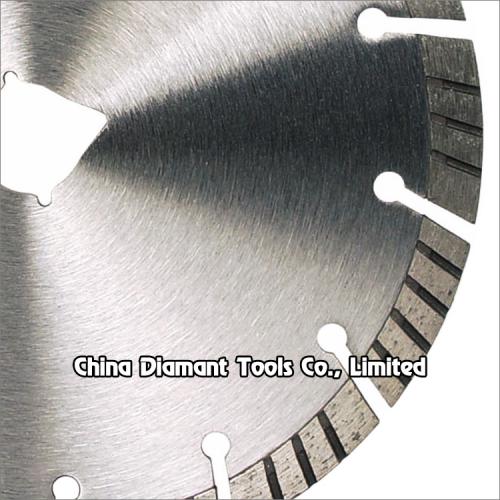 Hot press sintered diamond saw blades with diagonal turbo segments for fast dry cutting various hard, medium, soft stone such as granite, marble, sandstone, limestone, etc. without water or with less water.